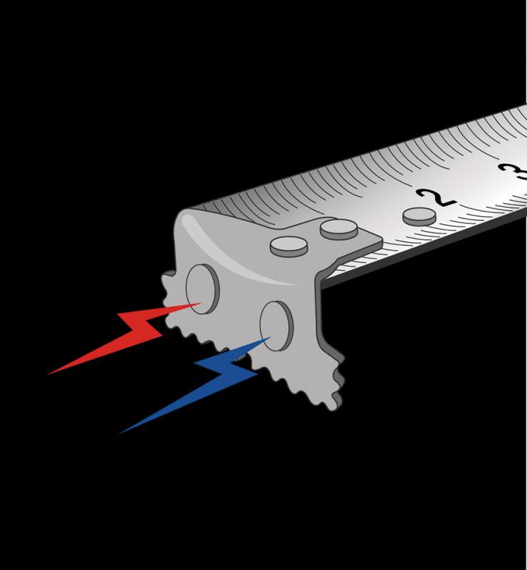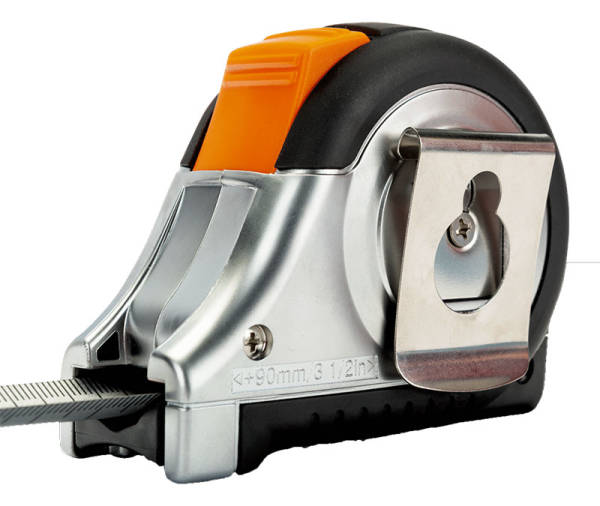 Måttband med band i rostfritt stål med matt nylonbeläggning, med mått på båda sidor i kontrasterande tryck som är lätt att läsa av.