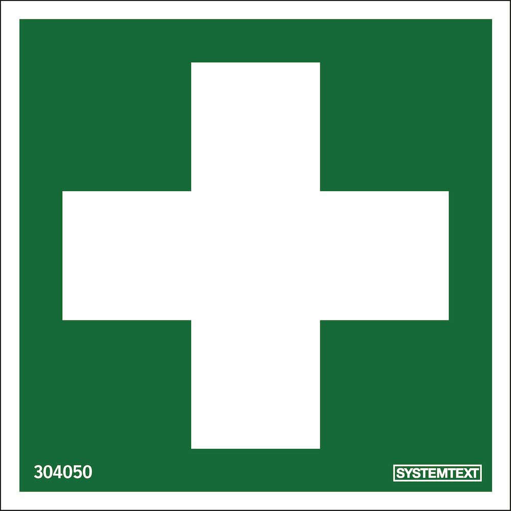 Självhäftande dekal för första hjälpen. Vit symbol på grön bakgrund enligt ISO 7010