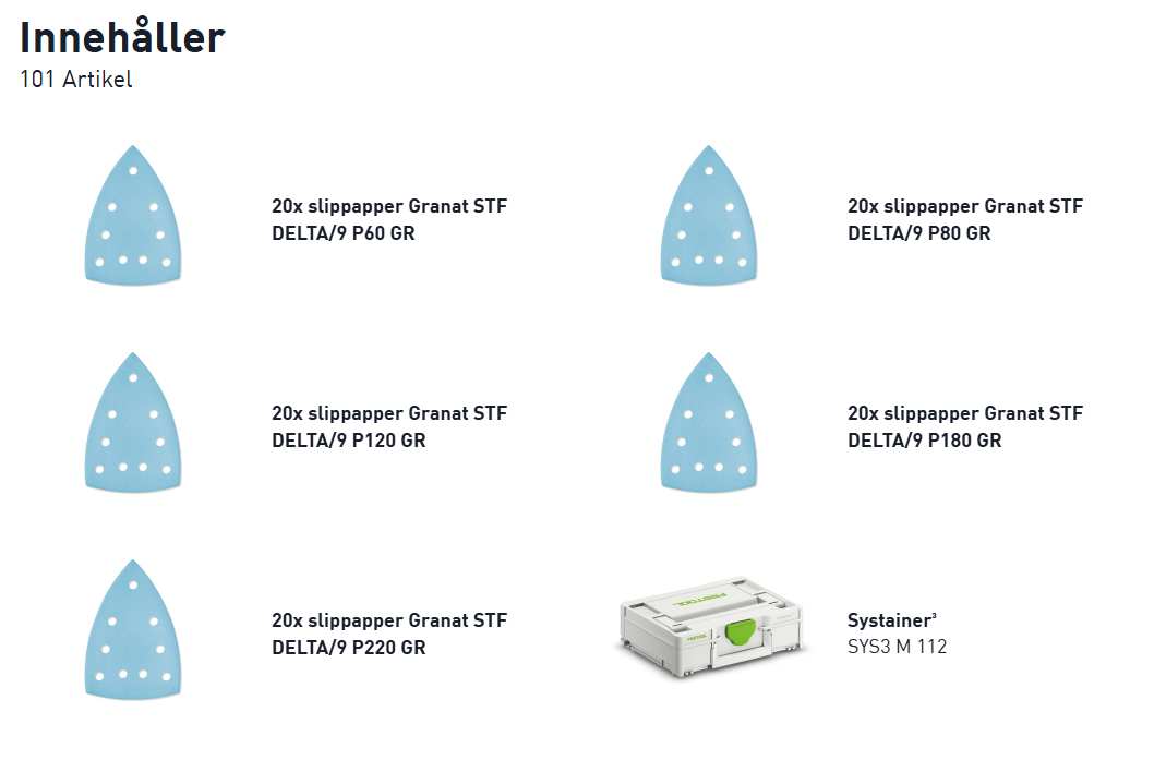 Slippappers-Systainern presenterar sig som ett idealiskt komplement till din slipmaskin. Med sitt breda utbud av kornstorlekar är den ett perfekt första steg så att du kan se vad Granat-slippappren klarar. 20x Granat-slippapper från P60 till P220 finns alltid nära till hands.