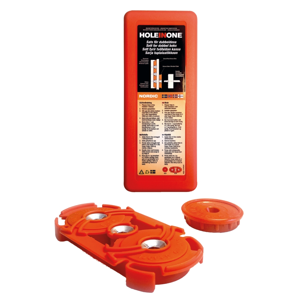 Levereras i praktiska förvaringsask i hårdplast och innehåller följande: 1 st insats för dubbeldosa med ytterdiameter 2x 75 mm och 1 st magnetsökar