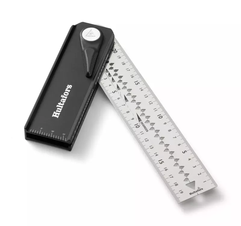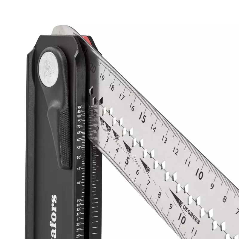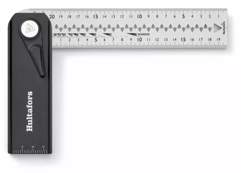 Om du vrider bladet mer än 180° så kan du använda motsatta sidan av anslaget, vilken inte har någon skåra där exempelvis tunna plåtdetaljer kan glida in. Med ett vred kan du ställa om den till en steglös smygvinkel för att kopiera vinklar mellan 0 och 270 grader. Vredet kan också användas för att låsa den i valfri vinkel. På blad och anslag finns skalor för att mäta och sätta vinklar mellan 0 och 90 grader. Vinkelhaken är också helt hopfällbar vilket gör den lätt att förvara och ha med sig i fickan på arbetsbyxorna. Bladet är 45 mm brett för att passa arbete med vanliga regelbredder och en centrumlinje underlättar om du vill sätta ut markeringar för båda sidor av varje regel. Bladet har även märkskåror, med 5 mm mellanrum, som kan användas för att rita eller skära en linje parallellt längs en kant. En robust led och ett 25cm långt blad av 1 mm tjockt, höghållfast rostfritt stål ger en väldigt tålig produkt som håller länge och tål tuffa arbetsmiljöer. Noga utvalda material och tillverkningstekniker som CNC-fräst anslag och ett blad skuret med precisionslaser ger hög noggrannhet; vinkeltolerans ±0,06° (±1 mm/m).