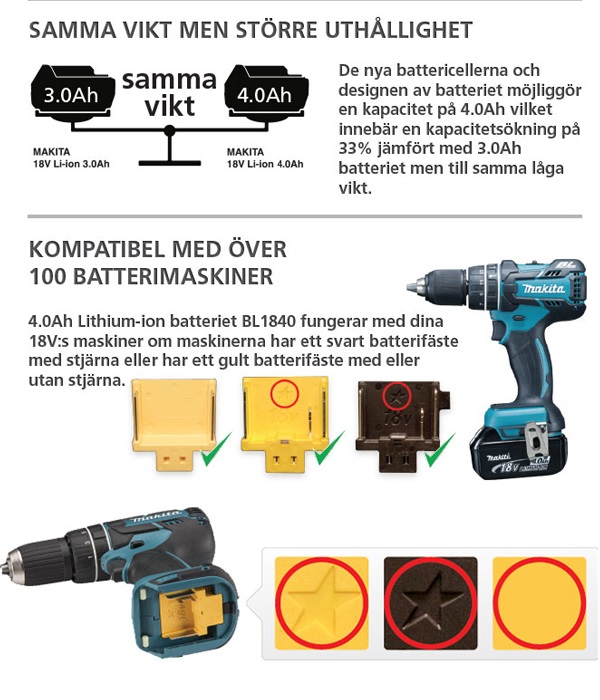 OBS! Batteriet fungerar med Makitas 18V maskiner om maskinerna har ett svart batterifäste med stjärna eller har ett gult batterifäste med eller utan stjärna. Se bild för illustration.