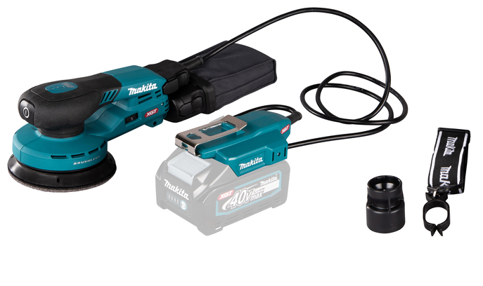 Den nya sladdlösa excenterslipmaskinen i 40V serien slipper man ett tungt batteri på maskinen genom att ansluta batteriet med en batteriadapter med en kabellängd på 1,6 meter. Idialiskt om man använder slipmaskinen med dammsugare så kan sladden löpa längst slangen. Alternativ om du använder dammpåsen så kan man fästa batteriet på bältet med bältesklämman på adaptern.