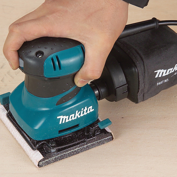 Planslipmaskin med 200 W motor och 14 000 rotationer per minut. Maskinen är utrustad med ett ergonomiskt gummerat handtag och en dammskyddad aluminiumkonstruktion för bottenplattans fäste.