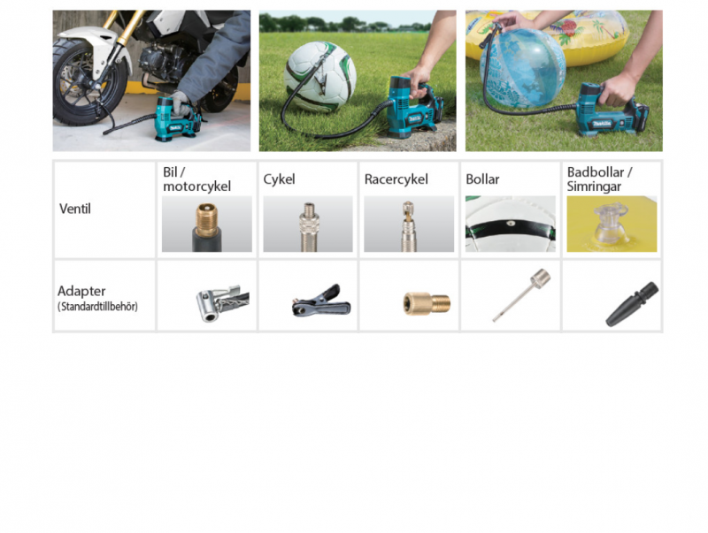Levereras med flera olika ventiler för bildäck, cykeldäck och olika typer av bollar.