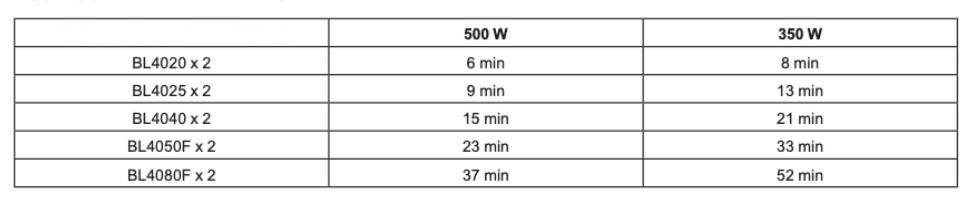 Körtiden med 2xBL4050 (5Ah) batterier är 23 minuter på 500 watt.