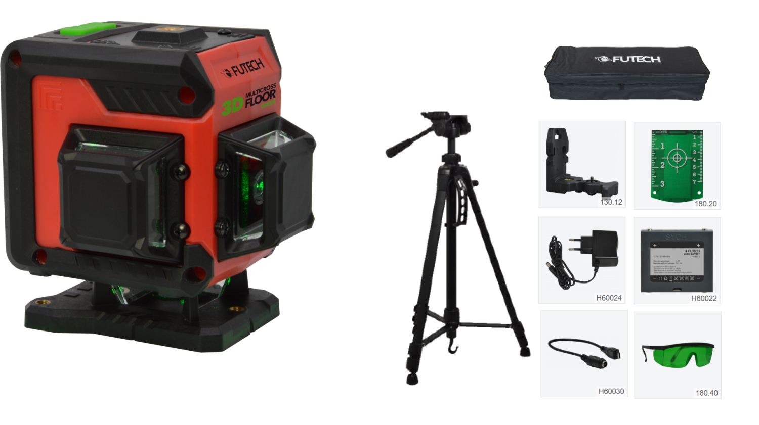 Kompakt, självnivellerande grön multikorslaser med 3 x 360°-linjer speciellt framtagen för golv och plattsättare där horisontallinjen är underst på lasern och endast är 15 mm från golvet vilket är en stor fördel vid arbeten med golv, flytspackling och kakel.