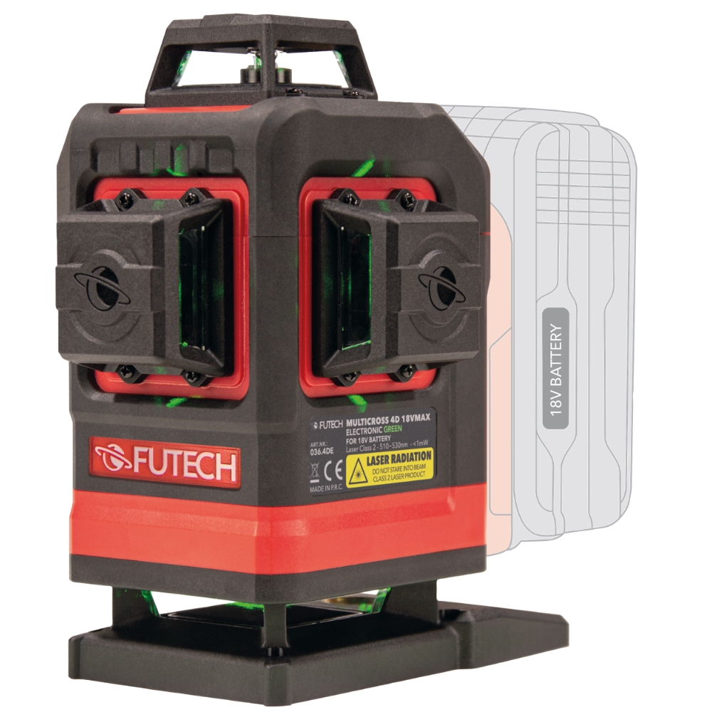 Möt Bouwlaser Multicross 4D 18V MAX Electronic – den nya standarden inom precision och bekvämlighet. Denna 4D-korslaser projicerar två ljusa gröna horisontella och vertikala linjer runtom, vilket gör den perfekt för alla typer av jobb. Med den medföljande fjärrkontrollen kan du arbeta snabbare och mer effektivt. Den drivs av 18V-batteriteknik, är kompatibel med alla större märken och erbjuder maximal flexibilitet på arbetsplatsen. Tack vare motoriserad nivellering, tiltfunktion och tilt-skydd får du exceptionell noggrannhet varje gång. Den andra horisontella linjen, placerad bara 20 mm över golvet, gör den idealisk för golvläggare och inredningsproffs.