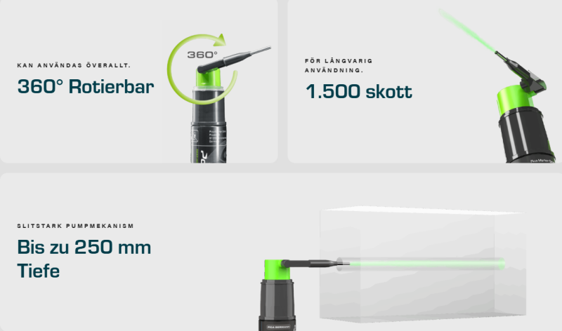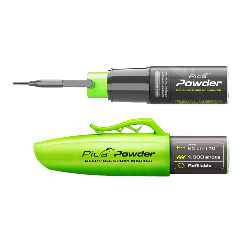Djuphålsmärkare Pica Powder. Enkel att fylla på och varje refill räcker till upp till tre påfyllningar. är det smarta och effektiva sättet att markera borrhål – helt utan kontakt. Med grönfluorescerande kritpulver får du en tydlig och exakt markering, även genom borrhål upp till 25 cm djup