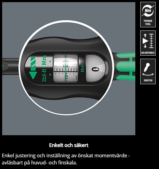 Klickmomentnyckel i typiskt Wera-utförande. Mycket robust konstruktion med hög noggrannhet enligt DIN EN ISO 6789-1: 2017-07. Enkel inställning och fixering av det förutbestämda värdet. Den hörbara och taktila knäppningen när skalvärdena uppnås underlättar också säker inställning av det önskade momentvärdet. Den robusta utlösningsmekaniken ger en tydligt hörbar och taktil signal när inställt moment uppnås. För högeråtdragning och med omkopplingsbar spärrfunktion med 45 tänder.