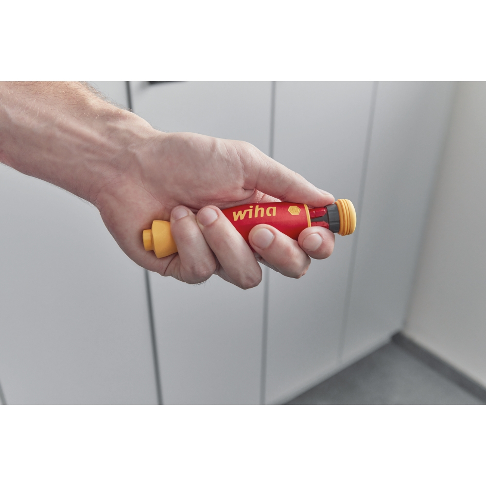 Den kompakta och lätta PocketMax från Wiha får enkelt plats i skjort- och byxfickor och är den perfekta följeslagaren för elektriker. I den säkra bitsdepån i handtaget finns fyra slimBits. Tack vare den magnetiska stängningen kan bitsdepån enkelt öppnas när man vill ta ut slimBits. Du behöver aldrig mer slösa tid på att leta rätt på den bits du söker. När du stänger den glider bitsdepån enkelt tillbaka i skaftet och försluts med magneten. En annan fördel är det vridbara locket som gör hanteringen bekväm. Även när det gäller säkerhet erbjuder PocketMax för elektriker det maximalt möjliga. Både magasinbitshållaren och de slimBits som ingår i den är certifierade enligt den internationella standarden IEC 60900. De smala, 75 mm långa slimBitsarna garanterar en perfekt åtkomst till djupliggande skruv- eller fjäderklämmor tack vare skyddsisoleringen som är fullständigt integrerad i den främre delen av bitsen.